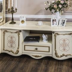 Тумба-ТВ "Энрике" в цвете крем глянец восхищает своей красотой. Дизайнеры богато украсили мебель различными узорами и декорами, создав образ антикварной мебели.