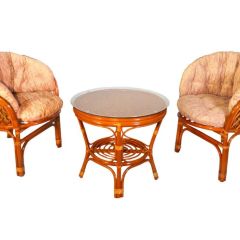 Комплект из натурального ротанга, состоящий из двух кресел и круглого столика с плетеной столешницей. Стекло входит в комплект.