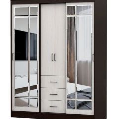 Изделие представляет собой комбинированный шкаф-купе. По краям шкафа располагаются платяные отделения с раздвижными створками, укомплектованные одной верхней полкой и металлической штангой. Посередине располагается бельевое отделение, которое состоит из двух секций. Верхняя секция с двумя распашными створками комплектуется тремя полками. В нижней секции находятся три выдвижных ящика. Раздвижные створки шкафа комплектуются декором из зеркал с фацетом. Декор приклеивается к створке на фабрике.